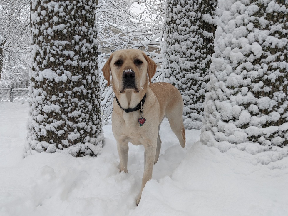 Marcus, a handsome one-year-old yellow Labrador/golden retriever cross, is pictured outside on a snowy day. He is standing between two tree trunks with another behind him. The trees are dappled with freshly fallen snow creating a fascinating pattern of small white snow mounds on the bark of the trees. Marcus has a dab of snow on his nose and is looking at the camera with an inquisitive look. His golden coloring contrasts beautifully with the white snow and tree trunks behind him.
