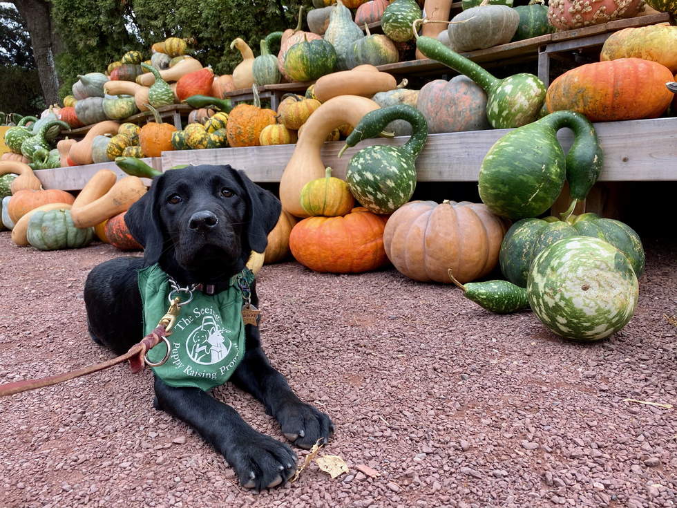 Victory, a six-month old female black Labrador/golden retriever cross, is laying on the ground looking attentively at the camera with a serious expression on her face. She is wearing her green Seeing Eye puppy scarf and it is facing forward so the white logo can be seen. She is also wearing a rainbow striped color with a gold star name tag and a martingale attached to a brown leather leash. The ground is made up of brown gravel and behind her is an assortment of various shades of orange and green pumpkins and squashes that are scattered across a set of wooden shelves.