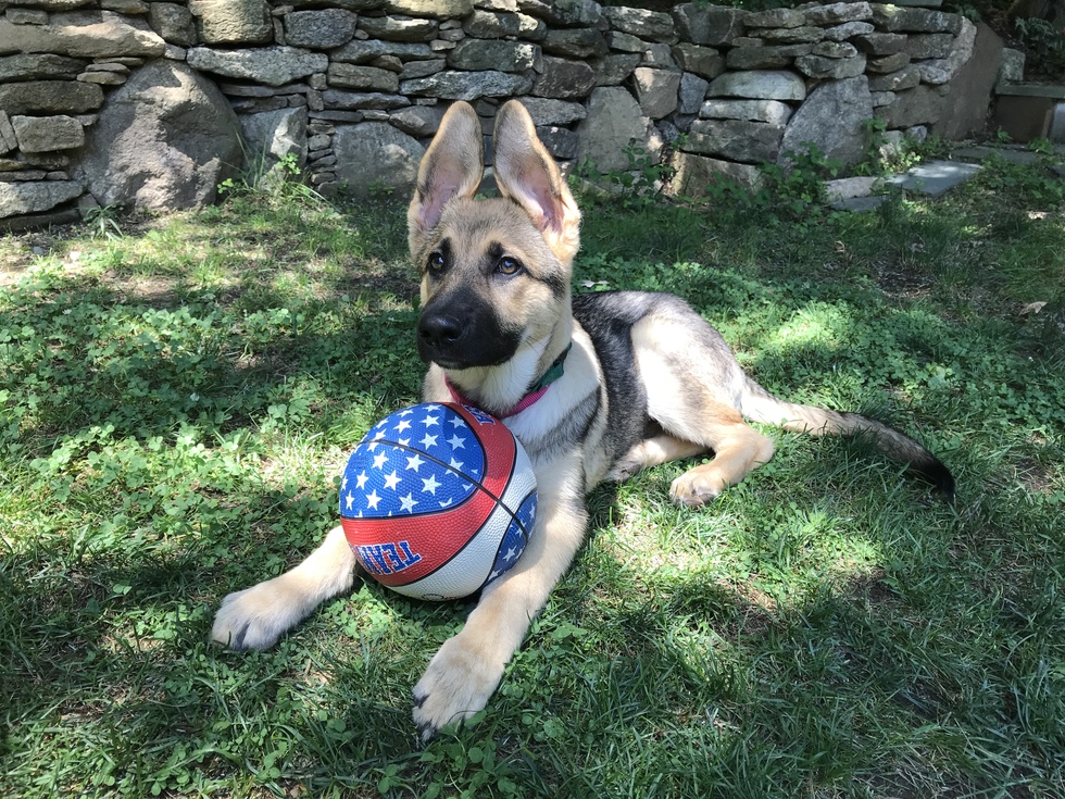 In this picture, a cute four-month-old sable German shepherd is pictured posing for the camera on the Fourth of July. Her fur is very light in color, but her snout and the tip of her tail are black. Her ears are standing so straight that they are nearly touching each other at the tips. Her favorite ball, which is a red, white, and blue basketball, is resting between her front legs and she appears ready to spring into action. She is an excellent defensive player with a quick eye and nimble footwork, however, her passing skills still need work.