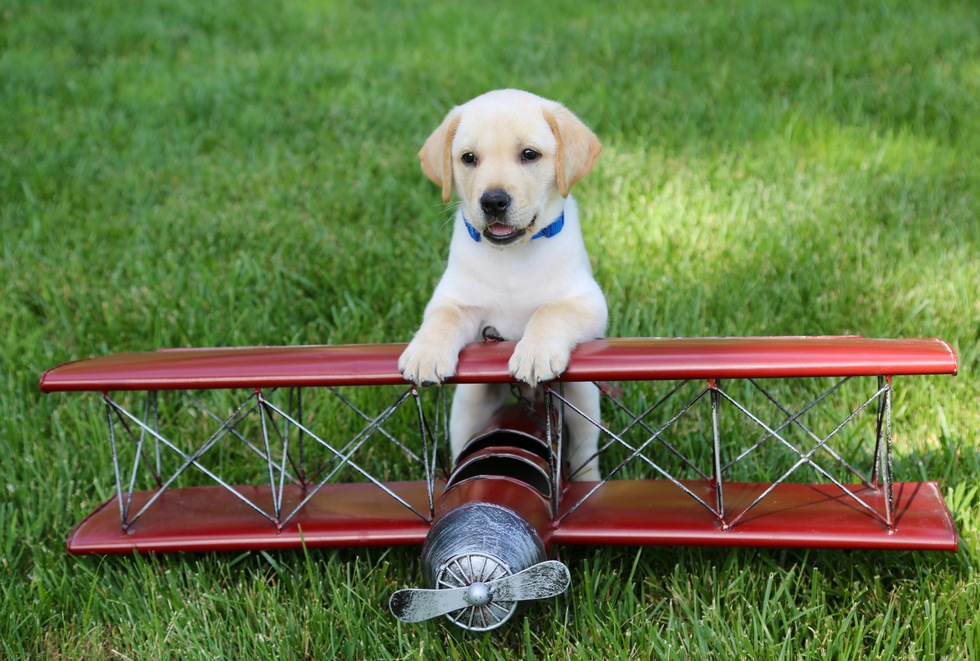 Orville, an eight-week-old male yellow Labrador/golden retriever cross, is seen propped up with his front paws on top of a small, red vintage airplane. Orville proudly shows off his balancing skills as he models himself after his namesake and inspiration, Orville Wright! His mouth is slightly open with a sweet smile as he poses on the lush, green summer grass ready to take flight!