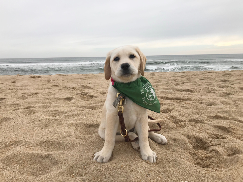 Joyce, a three-month-old yellow Labrador/golden retriever cross, is sitting on a sandy beach, with small ocean waves rolling in the background. She is wearing her green Seeing Eye puppy scarf and has a leather leash attached to her. She is sitting on her leash which is tethered to a stake in the ground behind her and out of view.