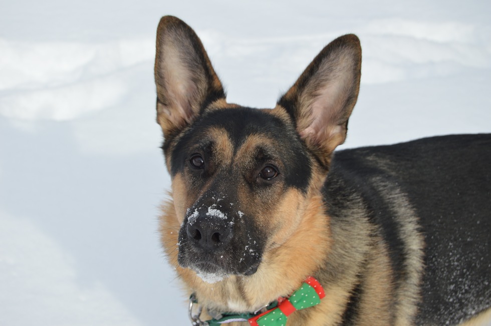 In this photo is a close-up of a young German shepherd with snow on his nose gazing intently at the camera against a bright white, snowy background. He has a dark face, light tan eyebrows and shoulders, and he is wearing a green and red bow tie on his collar.