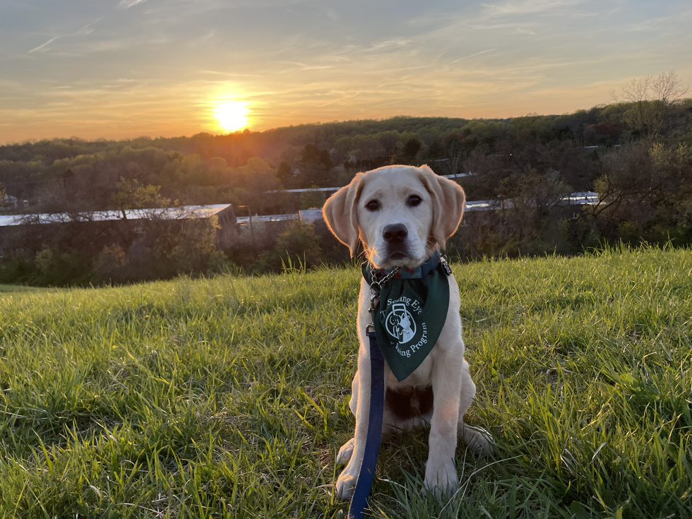 Handsome Jake, a male yellow Labrador/golden retriever cross, is sitting in a field of green grass with a slack dark blue leash and his martingale chain visible in front of him. His ears are perked up and he is staring straight into the camera. His green Seeing Eye puppy scarf is draped in front of his chest. On the horizon behind him there are treetops and some building roof-lines with the sun setting. The sun is a bright yellow and orange ball to the left of Jake's head and the sky is a gradient of light orange with the trees below and the blue sky above.