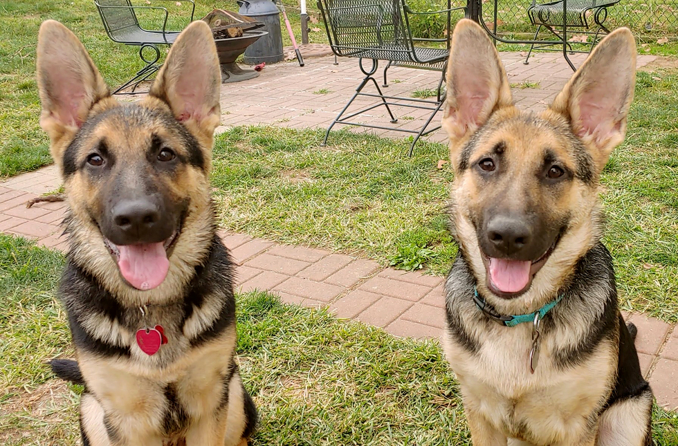 Five-month-old black and tan German shepherd brothers, Upshaw on the left and Ullrich on the right, sit in the green grass smiling lovingly at the camera with their pointy ears up, pink tongues out and brown eyes shining. Upshaw has red tags hanging from his collar which is hidden under his thick fur and Ullrich is wearing a green collar with silver tags hanging from it. In the background there is a brick tile walkway and patio with black wrought iron furniture, a black fire pit and an old black iron milk can.