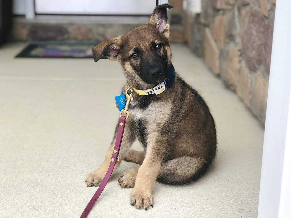 Isley, a cute young sable German shepherd, is pictured sitting on a front porch. He is looking at the camera with his round puppy eyes and his head is tilted to his right. One of his ears is ear up and one stands straight out to the side. He has on a maroon leash and a yellow, navy and white puppy collar.