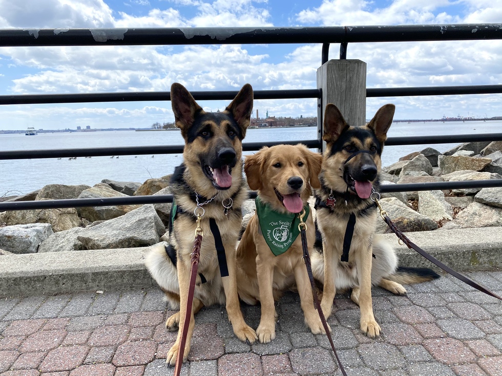 Manitou, an 11-month-old male black and tan German shepherd, and Yeager, a 10-month-old male German shepherd of the same coloring, sit on either side of Arthur, a six-month-old male golden retriever. Both shepherds are wearing their green Seeing Eye puppy vests, while the golden is wearing his green Seeing Eye puppy scarf. All three puppies are enthusiastically looking at the camera with their tongues out and leashes slack in front of them. They are at Liberty State Park, sitting in front of fence railings. Beyond the railings are many large rocks and New York Harbor.