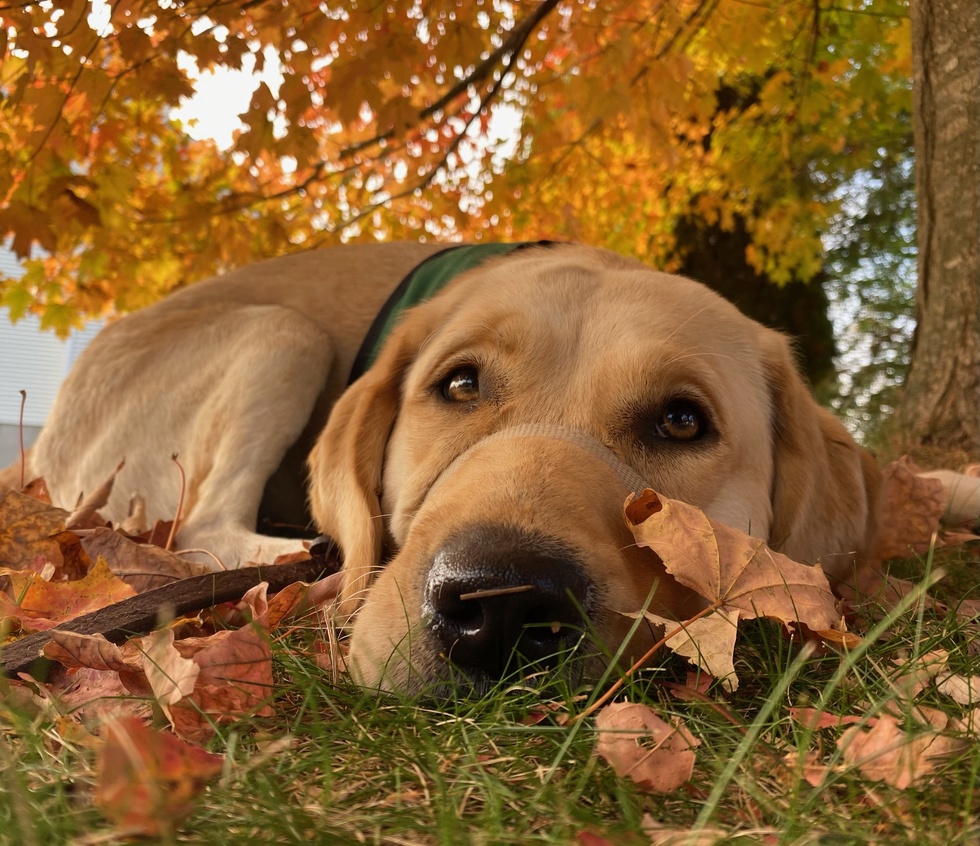 This close-up shows Elana, a sweet 17-month-old yellow Labrador/golden retriever cross, lying down with her face resting in the green grass amongst the Autumn splendors. Fallen amber leaves frame her face and body. Behind her, branches of a tree are seen with leaves ranging in color from green to yellow to orange. Her expressive brown eyes look longingly at the photographer.
