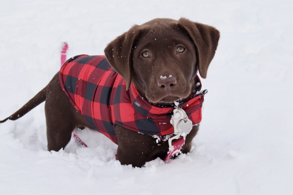 An adorable nine-week-old chocolate Labrador retriever stands chest deep in bright white snow while a light snow continues to fall gently on her. She is wearing a red and black plaid coat while being introduced to her first winter snowfall. Her Seeing Eye tag hangs from her collar. She looks expectantly toward the camera while sporting a small clump of snow on her cute little nose, awaiting more winter adventures.