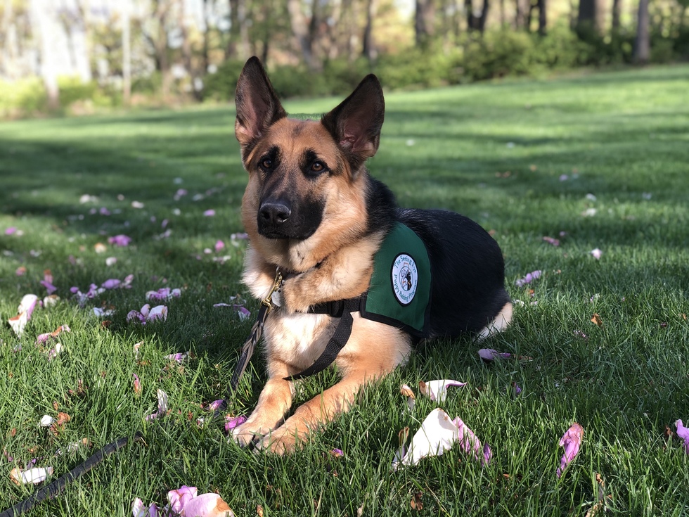 A regal German shepherd is pictured wearing her green Seeing Eye puppy vest as she rests proudly in a bed of deep green grass dotted with pale purple petals that have recently fallen from a nearby magnolia tree. She is wearing a purple flowered collar that matches the colorful leaves that are scattered around her. The beautiful one-year-old puppy is intently looking off in the distance eagerly awaiting the next command from her puppy raiser.