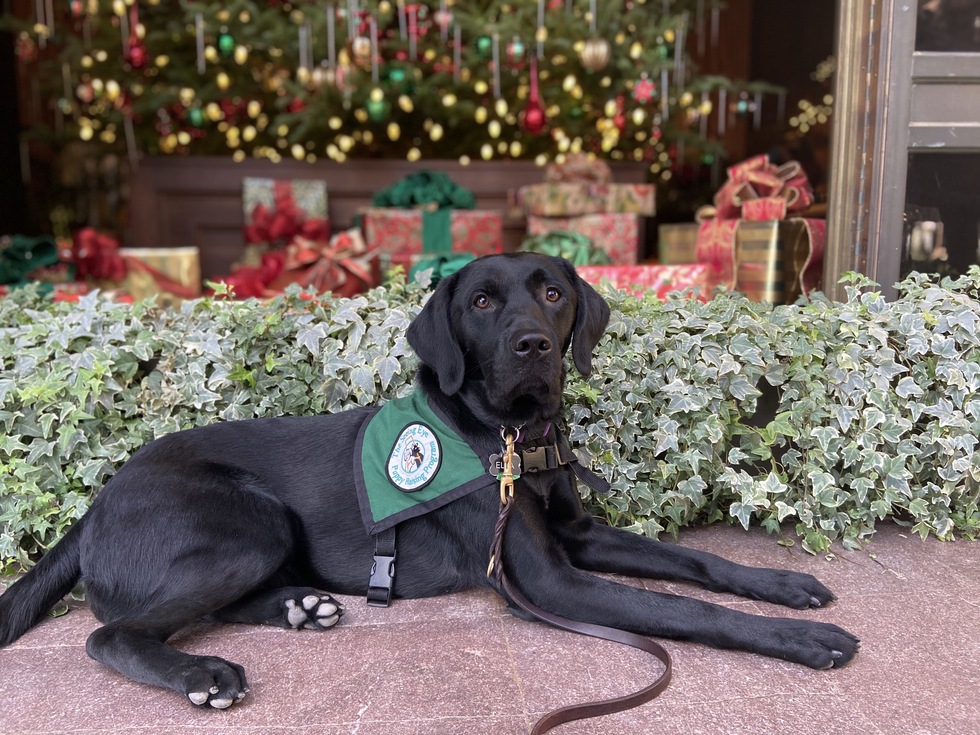Pictured is Ella, a one-year-old Labrador/golden retriever cross with short black fur. She is laying comfortably on the tiled floor in front of a row of plants with dense green leaves. Behind the plants is the base of a beautifully decorated Christmas tree with a variety of perfectly wrapped presents underneath. Ella is on a slack leather leash, and proudly wearing her green Seeing Eye puppy vest and looking intently just over the camera at her raiser.