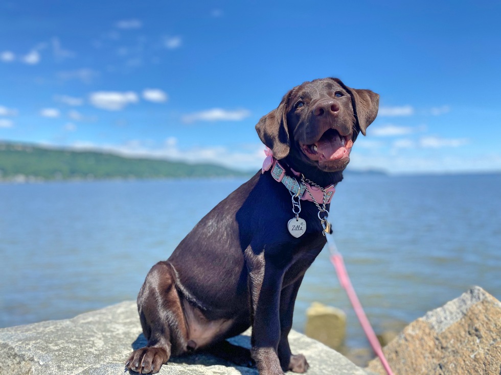 Pictured is Zilla, a four-month-old chocolate Labrador/golden retriever cross, sitting on a big grey rock. She is looking attentively at the camera wearing a decorative blue and pink flat collar adorned with a pink bow and a pink martingale, which is attached to her pink leash that can be seen out of focus in the bottom right corner. Her adorable floppy brown ears are perked up and her mouth is slightly open making it appear as though she is smiling exposing her pink tongue. Out of focus behind her is a gorgeous view of the Hudson River, bright green grassy mountains and a bright blue sky with a few white fluffy clouds.