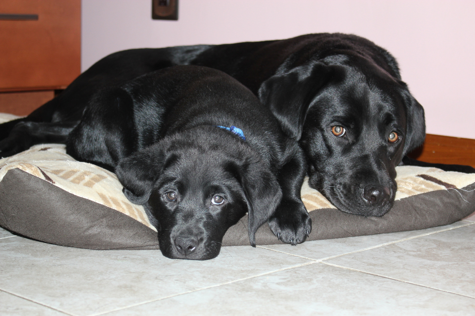 Male black Labrador retriever, Nate, and female black Labrador retriever, Fresca, are snuggled up together on their cozy tan and brown dog bed. The bed, which is on a tiled floor, is just big enough to fit these two pups whose faces are tilted slightly downward as they stare intently into the camera. The light-colored wall behind them enhances their shiny black coats while some brown cabinetry is peaking out of the top left corner of the photo.