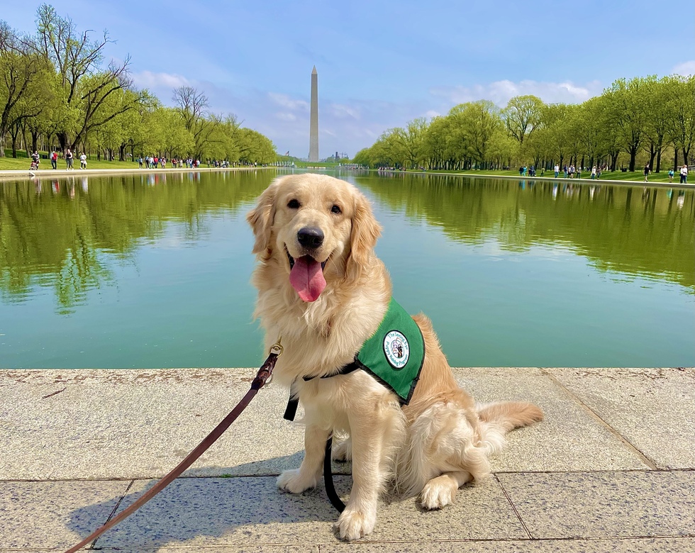 Cody, a 14-month-old male golden retriever, is pictured sitting in front of the Lincoln Memorial Reflecting Pool in Washington D.C. Sporting his green Seeing Eye puppy vest and a brown leather slack leash, Cody's fur is very fluffy as he smiles right into the camera. His mouth is open and his tongue is hanging straight out. It is a sunny spring day and massive green trees line both the left and right sides of the long, blue-green rectangular pool. The images of the trees are perfectly reflected along the edges of the water. The pool and trees lead to the Washington Memorial, a tall stone obelisk, which is seen centered in the distance against a blue sky backdrop, right above Cody's head.