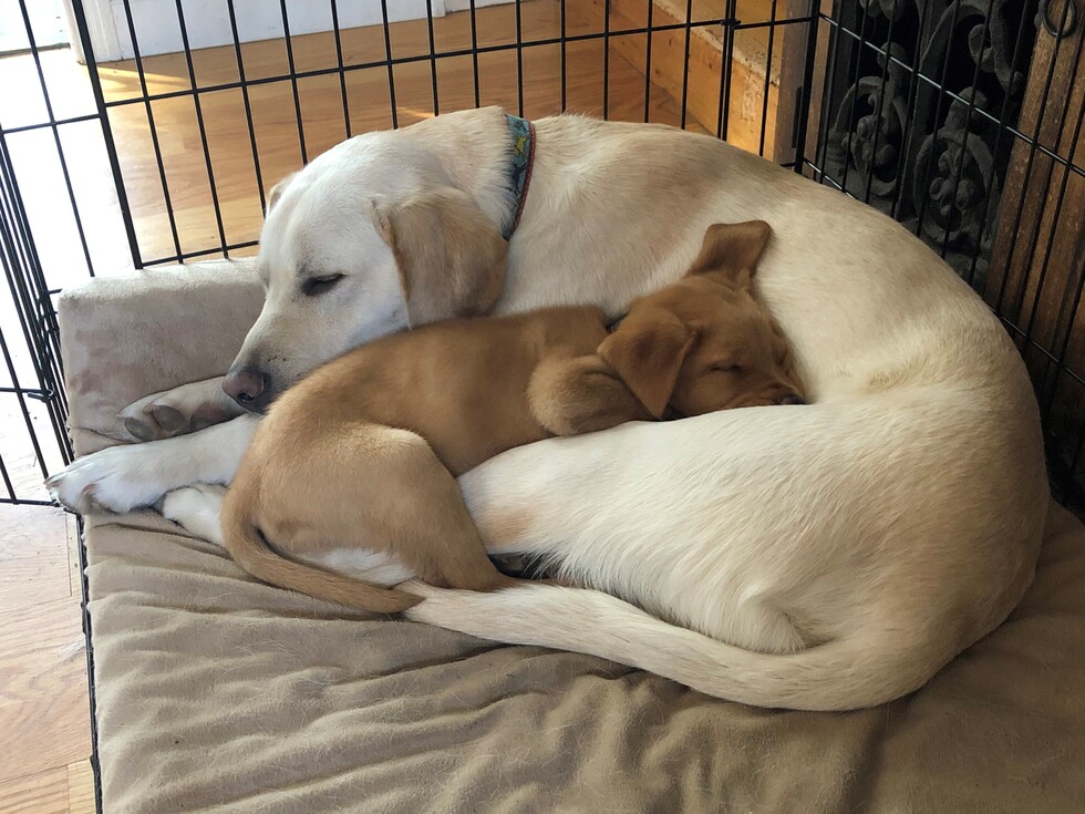 It is snuggle time for Dempsey, an eight-week-old ginger-colored male yellow Labrador retriever, and his new big brother, Wyatt, a nine-month-old yellow Labrador retriever. Facing the opposite direction, Dempsey is curled up in between Wyatt’s front and back legs, with his head resting comfortably on Wyatt’s golden blond belly. Both dogs are sound asleep as they lay in an open black crate on a plush, tan-colored dog bed. A peak of the sun’s rays on the wood floor outside the crate completes this cozy snapshot.
