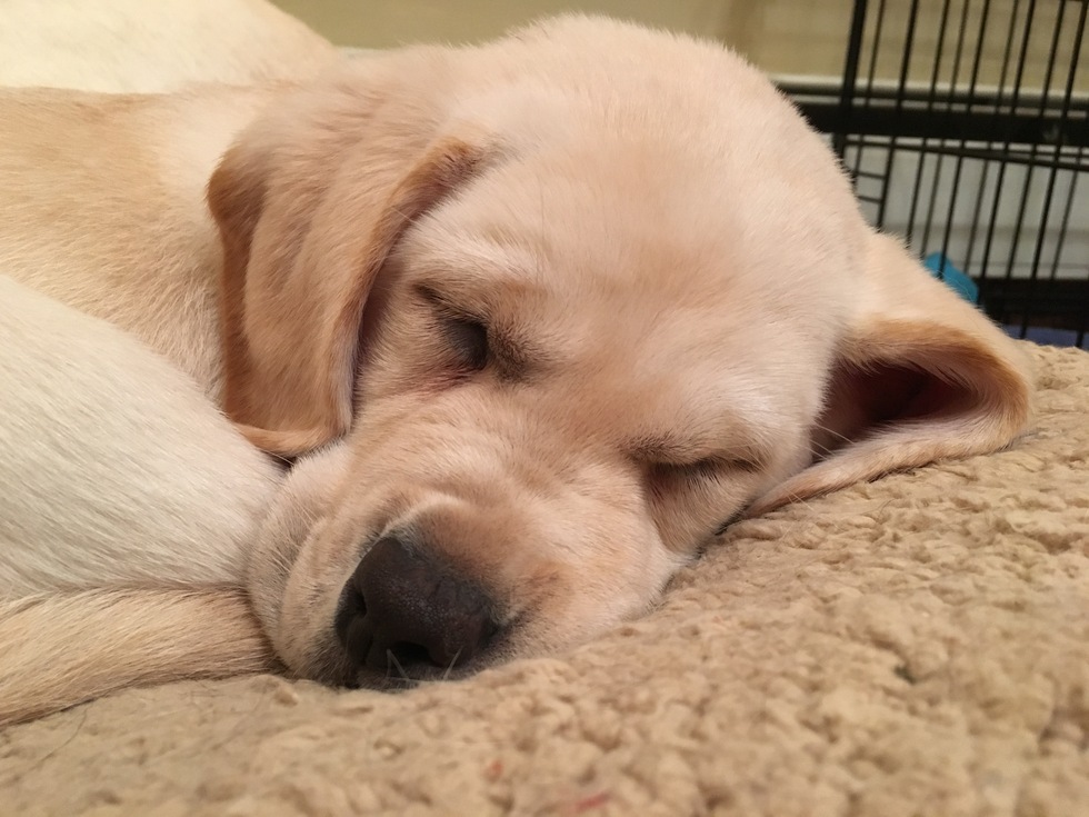 Eight-week-old yellow Labrador/golden retriever cross, Roland, sleeps soundly on her tan blanket. She is such a light shade of yellow that she nearly blends in with her bed. She is tucked in a tight little ball with her back feet nuzzled beneath her wrinkly puppy snout.