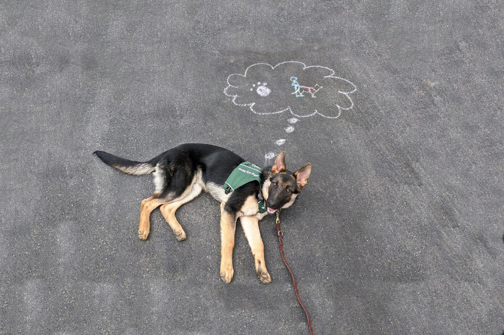 Six-month-old male German shepherd Birch has big dreams! In the photo, the black and tan pup is laying down on his side with his head slightly propped up and his green Seeing Eye puppy vest on. He is resting in the driveway after a neighborhood walk. Near the top of his head are bubbles drawn in sidewalk chalk that go up to a dream cloud. Inside the dream cloud is a paw print along with an illustration of a Seeing Eye dog guiding his person.