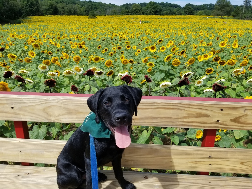 Kerwin, a five-month-old black Labrador/golden retriever cross, sits on a hayride truck in front of a large, bursting yellow sunflower field. He is looking straight into the camera with his big, beautiful brown eyes. His tongue is bright red and looks enormous compared to his tiny body. It is a hot, summer day and Kerwin is panting to cool himself. His green Seeing Eye puppy scarf is draped over his back. His short, black fur is a sharp contrast to the yellow sunflower maze behind him.