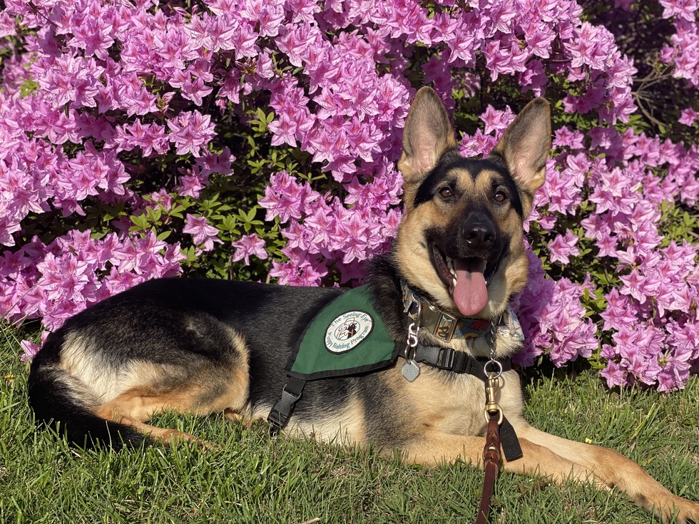 Pictured is Odin, a 21-month-old black and tan male German shepherd. He is laying down in the grass with his tan legs crossed in front of him. He is wearing his green Seeing Eye puppy vest, and his tongue is out of his mouth in a big smile! He is alert with his ears perked forward and is looking right at the camera. The background behind him is a bush full of large pink azalea flowers.