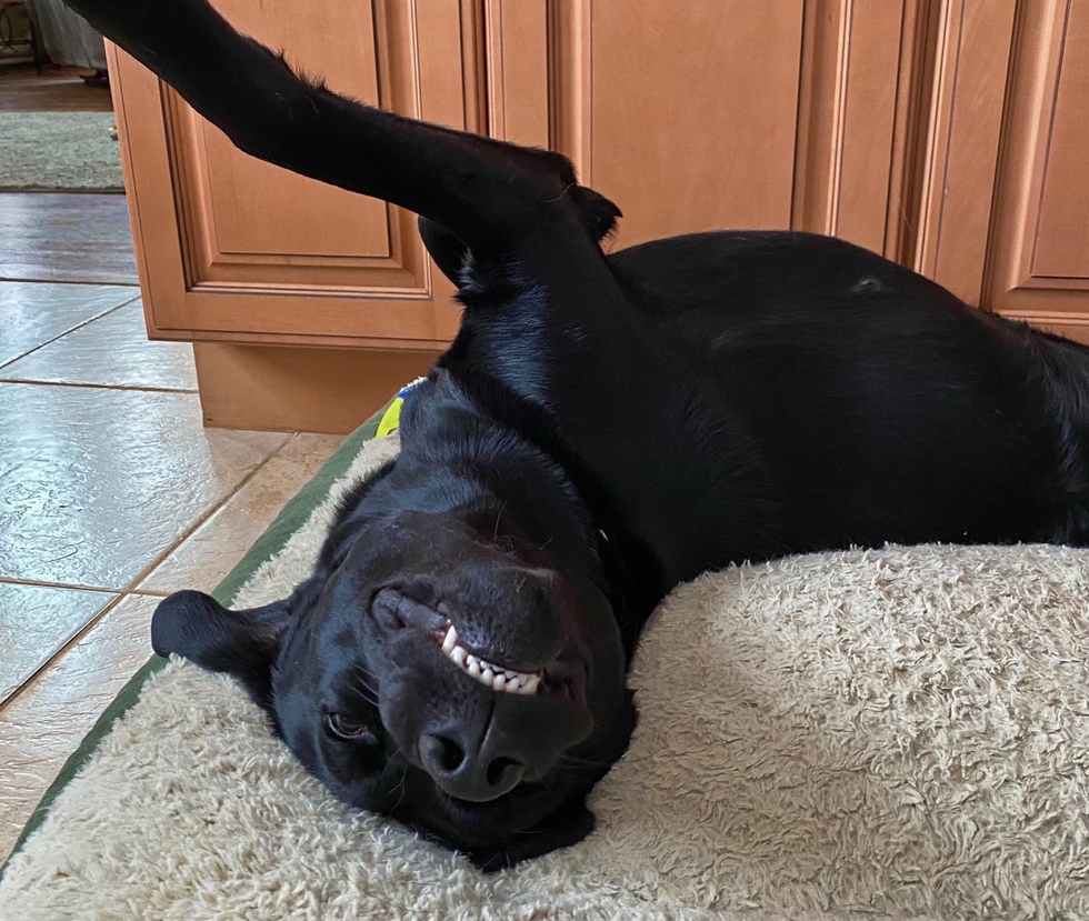 Biny, a 19-month-old black Labrador retriever puppy, is sleeping on her large, cushioned dog bed. She is on her back, stretched out with her feet in the air. She appears to have a huge, goofy grin as her lips fall back, showing her pearly white teeth.