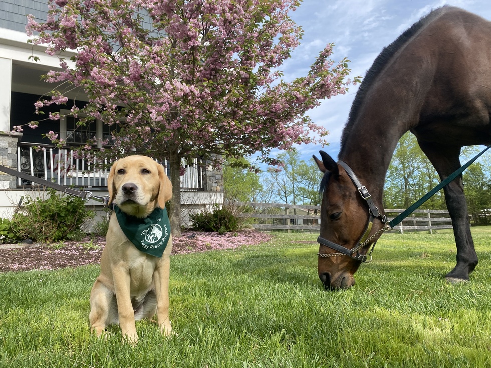 Jenny, a five-month-old yellow Labrador/golden retriever cross, is pictured wearing her green Seeing Eye puppy scarf on a beautiful spring day. She sits proudly in the grass in front of a large, blooming cherry tree with thousands of pink blossoms. She is looking attentively at the camera. Right next to her left side is a graceful bay horse with her head bent down as she grazes on fresh Spring grass. The sky is a pretty blue color with wispy clouds.