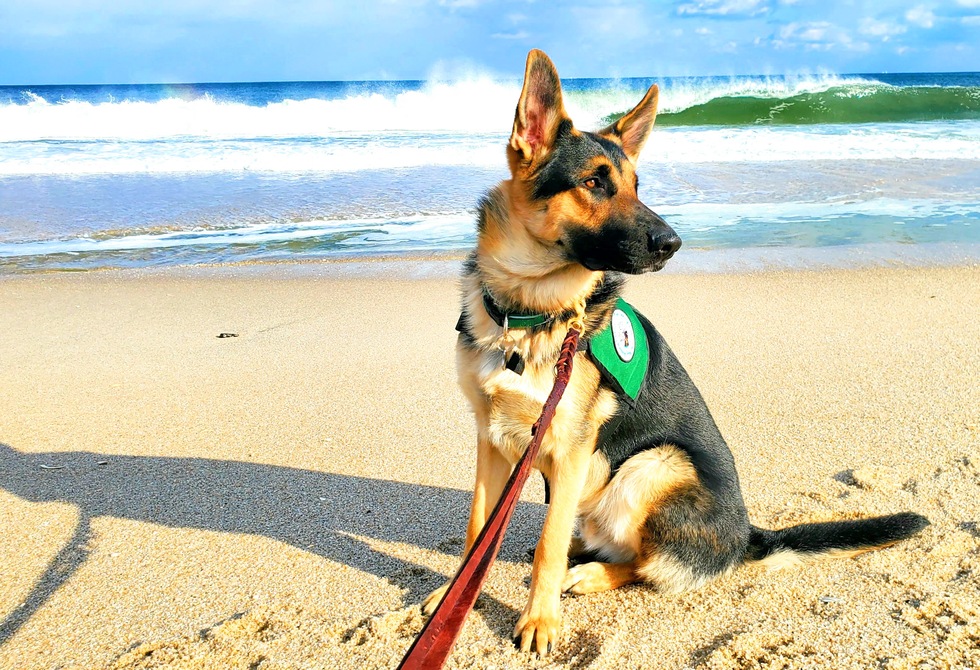 In the midst of a beach landscape sits a 10-month-old German shepherd in front of the crystal blue ocean, complete with white crashing waves spraying mist towards the blue sky. The shepherd is looking over his shoulder, while he sits on the squishy golden-brown sand. His ears are perked upwards, and he is wearing his green Seeing Eye puppy vest with pride.
