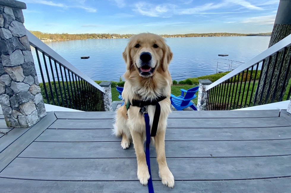 Alec, a golden retriever, is smiling wide at the camera. He is framed in the middle of the picture, sitting on a gray deck in front of a large blue lake with rippled waves in the water. He is wearing his green Seeing Eye puppy vest with a royal blue leash. Behind him is a bright blue sky with soft clouds. The sun is just beginning to set, and the light is giving his soft golden fur an extra glow.