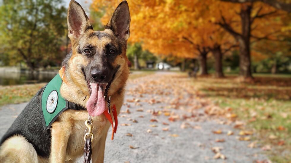 Falling for Autumn! Linda, an 18-month-old black and tan German shepherd in her green Seeing Eye puppy vest, basks in the warm autumn sunshine on a late October walk. Posing tall and proud, her ears are fully alert, eyes fixed directly to the camera, and long pink tongue hanging out. She is sitting on a light grey gravel path, sprinkled with orange and yellow crunchy leaves behind her. The path is edged with a lake on one side and trees on the other. The trees are all brimming full of warm yellow and orange leaves.