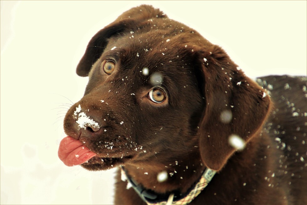 A 10-week-old female chocolate Labrador retriever is shown enjoying her first experience in snow. This close-up photo of Gwynne’s face shows her looking up at the sky. Her gorgeous brown coat and tip of her nose are dusted with snow as it falls around her. Cutest of all is her little pink tongue peeking out, catching the fluffy snowflakes as they fall. The expression in her amber-colored eyes is that of wonder and joy.