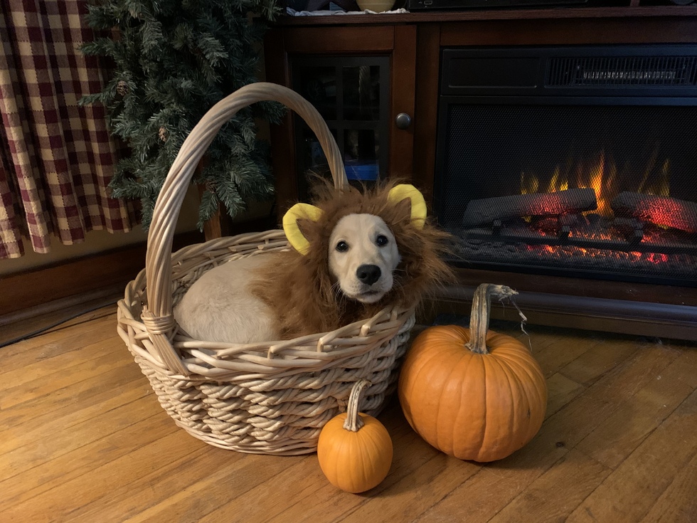 At nearly three months old, a fluffy golden retriever puppy with dark eyes and a coal black nose is dressed for Halloween. He is wearing a brown ‘lion mane’ hat with golden yellow ears. Darwin is laying in a wicker basket with a handle, placed in front of a roaring faux fireplace and looking directly at the camera. Two pumpkins - one large and one small – sit next to the basket.