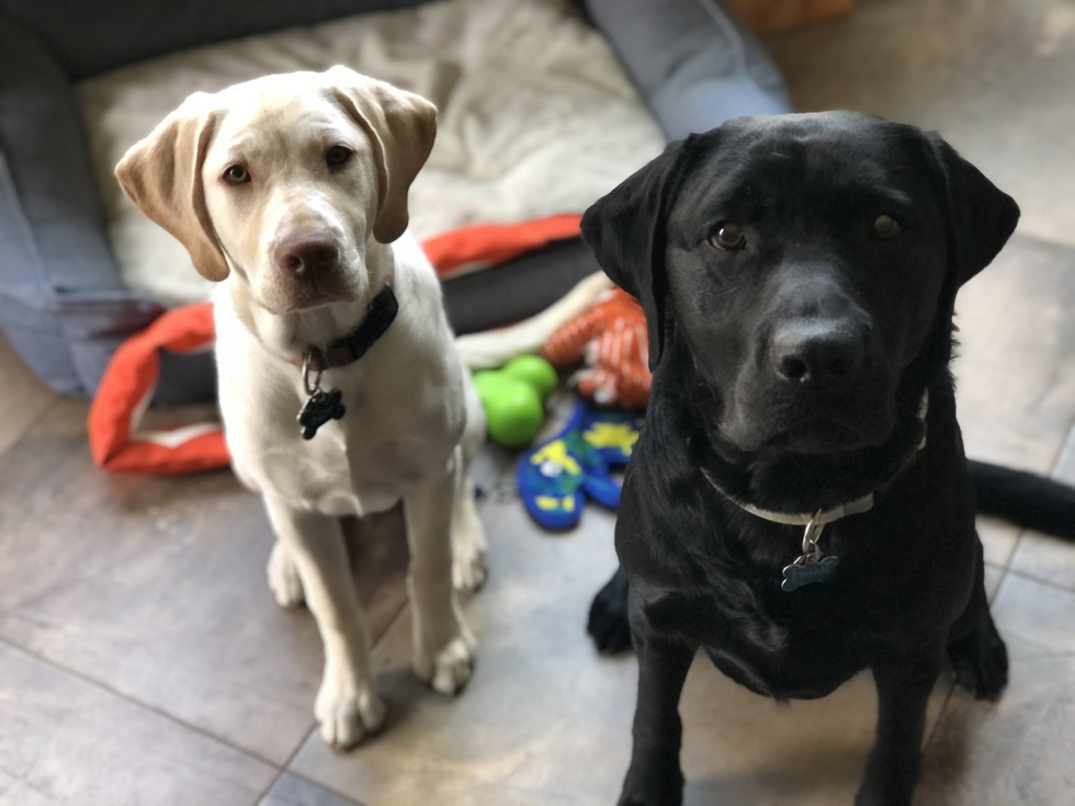 Indy, a yellow Labrador retriever with a brown nose, and Ethan, a black Labrador retriever with a shiny coat, are pictured with their eyes looking straight ahead and their ears perked looking alertly at the camera. They are both sitting in front of their dog bed on a brown tile floor. There are several toys scattered around the rectangular bed from a recent play session.