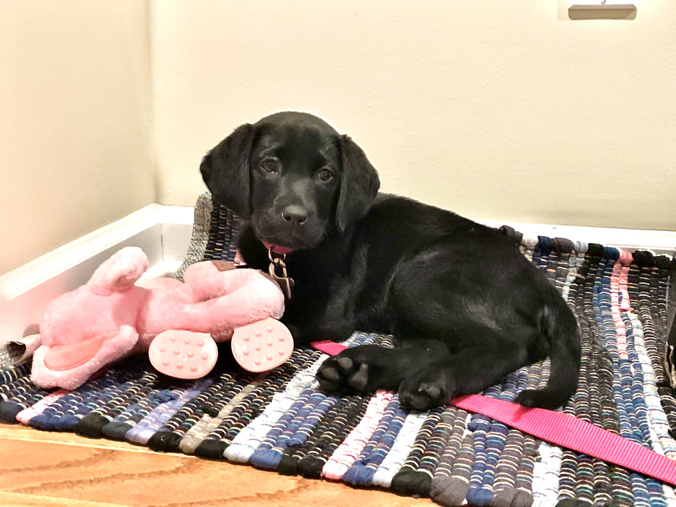 A small black Labrador retriever puppy named Rumor is lying down and peering at the camera with sleepy eyes. She is relaxing on a textured rug with various shades of blue. You can see her pink leash lying next to her along with a fuzzy pink elephant toy. Her black floppy ears frame her cute puppy face.