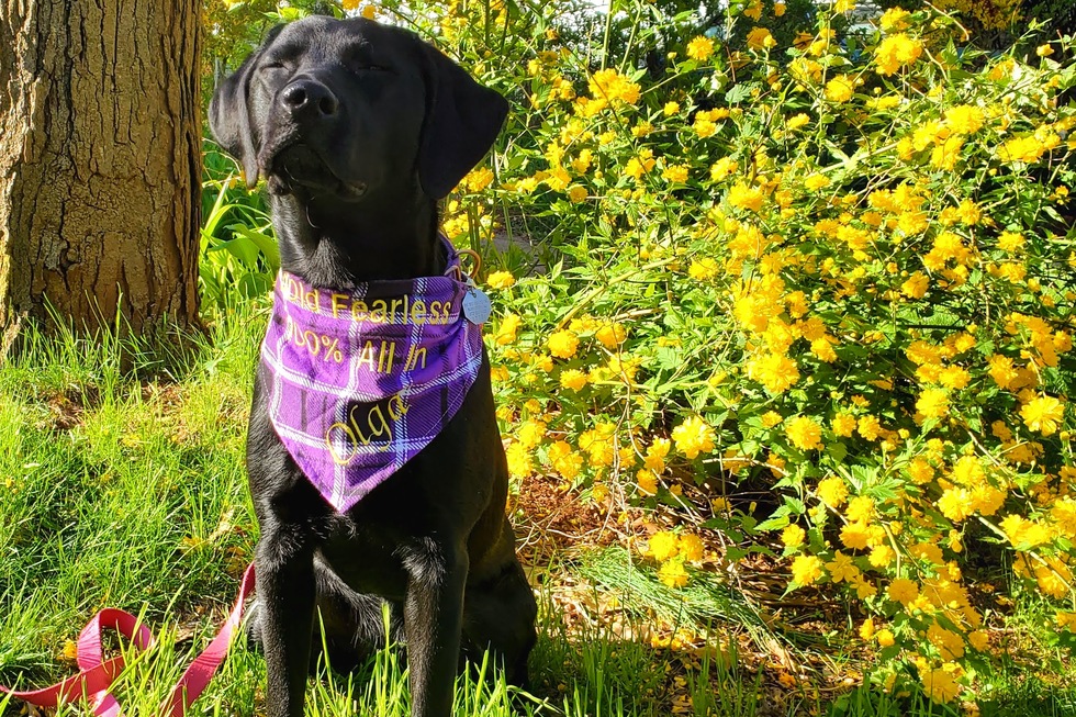 Olga, a 12-month-old female black Labrador/golden retriever cross, sits calmly in the grass beside a bush filled with bright yellow flowers. She sits with her head held high and eyes closed, appearing at peace as she enjoys the cool spring weather. She sports a purple and white bandana across her chest embroidered with her favorite motto written in bright yellow writing, "Bold, Fearless, 100% All In."