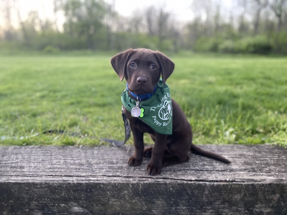 Talladega, a ten-week-old male chocolate Labrador/golden retriever cross, sits patiently on a worn wooden step. His dark, brown-colored body is turned slightly to the right while his face, complete with floppy ears and soulful eyes, is looking straight ahead. He is wearing his green Seeing Eye puppy scarf. His silver Seeing Eye tag and neon green name tag dangle from his blue color. There is green grass behind him and many trees in the distance. The sun has begun setting on the horizon.