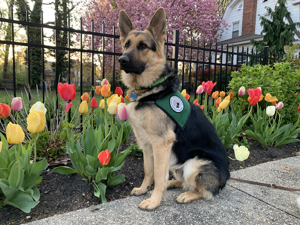 Handsome Walter, a male black and tan German shepherd, is sitting on a concrete walkway in a picture-perfect pose alongside a mulched garden bed filled with colorful tulips. The left side of his body is facing the camera, showing off his bright green collar, blue tag and green Seeing Eye puppy vest. Beyond the tulips there is a black aluminum fence and several mature trees, including one that has its generous delicate pink spring petals on full display. The upper right-hand corner of the photo shows the side of a white house, complete with several windows and a red brick chimney running straight up the center.