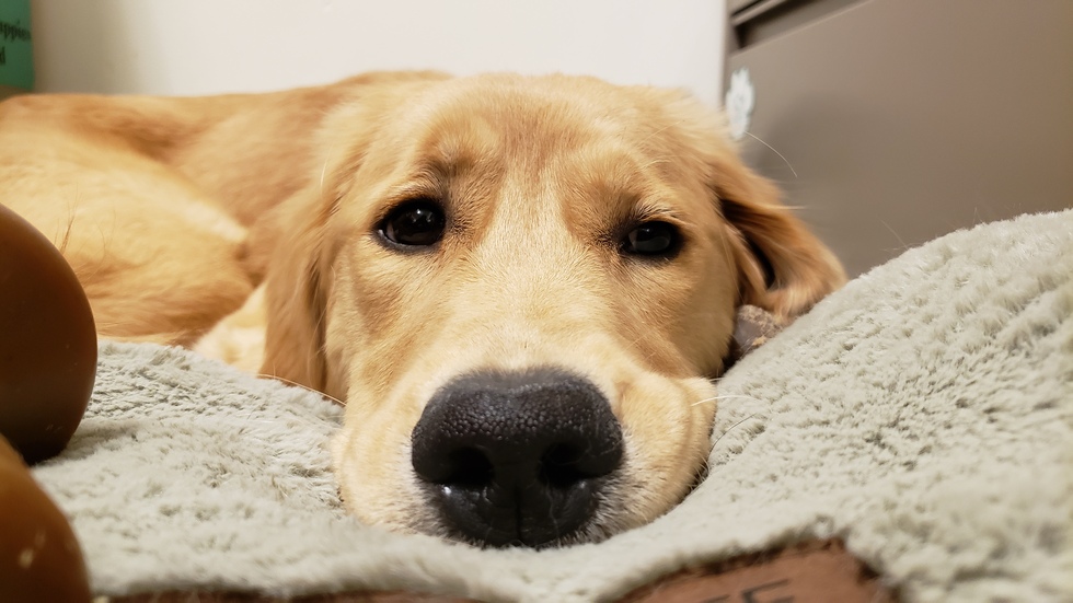 Isabella, a nearly full-grown female golden retriever, lies on a fluffy gray bed, the camera close to her face so her nose is the focus of the photo. She looks off to the right side of the camera, her body visible to the left in the background and curled up on the bed behind her. Her lips are slightly pushed up from the way her head is resting on the bed. A brown bone frames the photo on the left side.