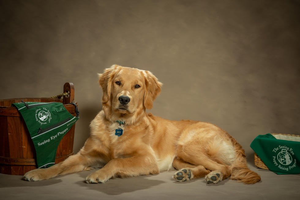 Iree, a nearly full-grown male golden retriever, lies on a dark tan photo backdrop looking proudly towards the camera. His ears are perked forward but his body is relaxed. On the left near his shoulder is a brown wooden bucket with his green Seeing Eye puppy vest draped over the side so the Puppy Raising logo is showing. On the right, by his tail, a green Seeing Eye puppy scarf is draped over a basket, also showing the Puppy Raising logo.