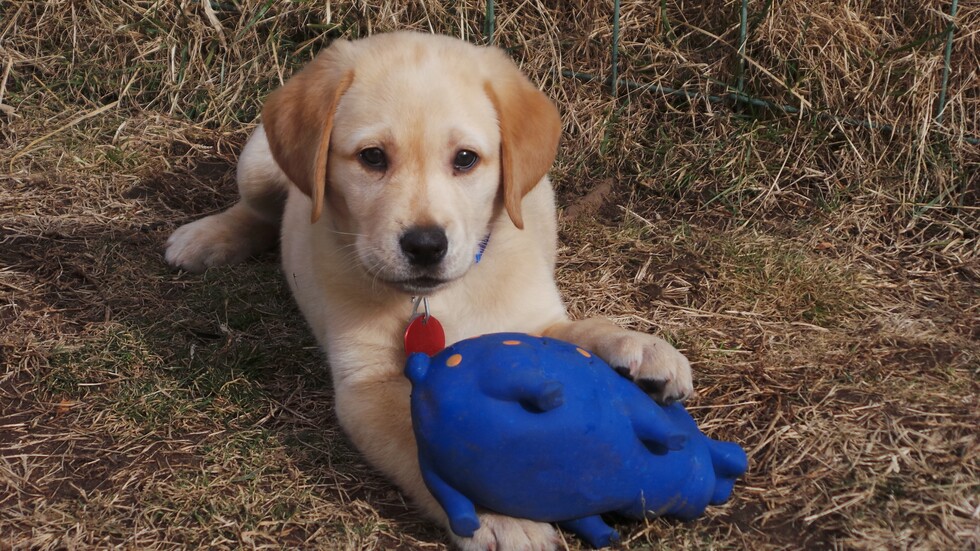 Zack, an adorable eight-week-old yellow Labrador retriever lays playfully on a dry grass lawn. He stares at the camera as if he was asking you to play with him. His brown eyes and black nose contrast with his light-colored fur and dark yellow ears. He wears a blue flat color with a red ID tag and his front paw playfully rests on a blue and yellow rubber pig toy.