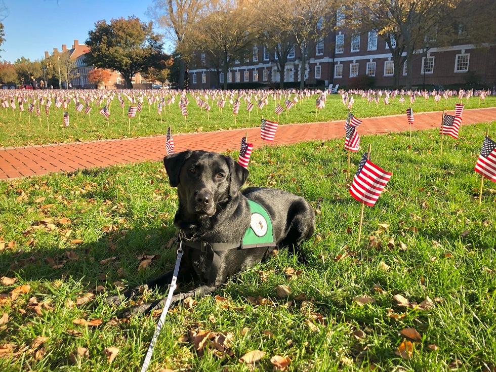Jane, a female black Labrador/golden retriever cross, lies in a green lawn on a bright and sunny day. The grass is dotted with hundreds of small American flags. Behind the lawn is the face of a large building adorned with lots of white windows. Jane looks right at the camera with soft and gentle eyes. Her black fur is smooth and shiny against her green Seeing Eye puppy vest.