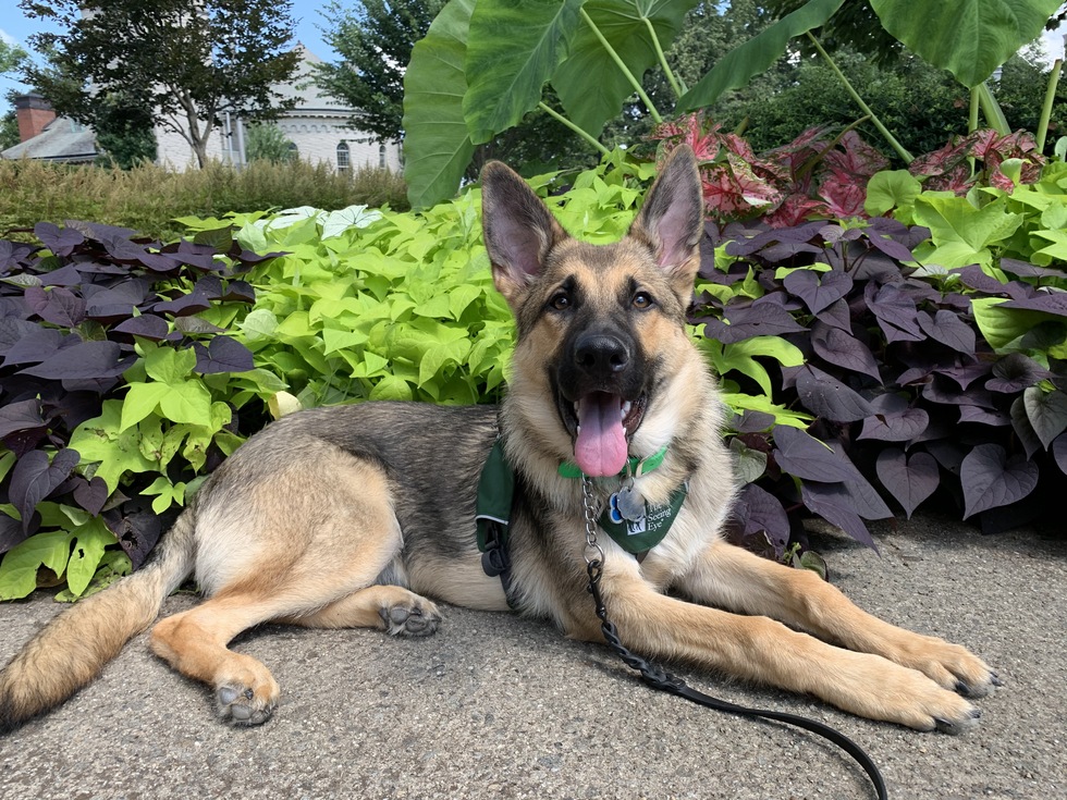 Leonard, a nearly full-grown sable German shepherd, lies on a paved path in front of leafy purple and green plants, each leaf almost as large as his paw. His legs are tan, and his body is a mix of grey, black, and brown. He is looking at the camera with his mouth open in a smile, tongue showing. He is wearing a lime green collar, his green Seeing Eye puppy vest, and a black leash attached to his silver training collar. His pointy ears are perked attentively, but his body is relaxed as he poses for the camera.