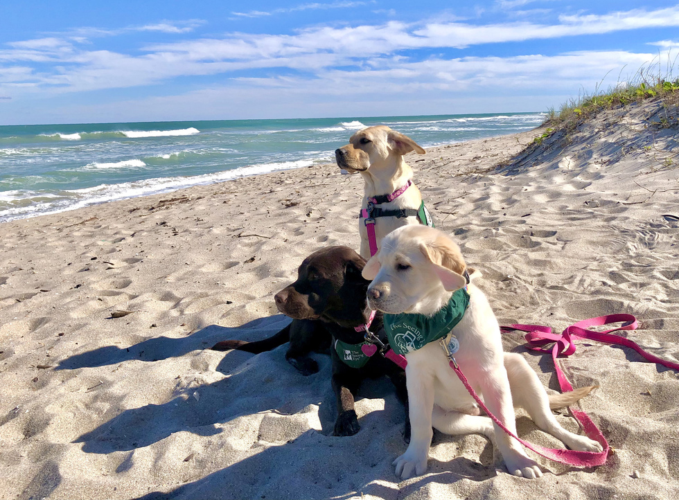 Three Labrador/golden retriever cross puppies are sitting in a line on a sandy beach with sand dunes, foamy waves, and puffy clouds in a blue sky. It is a bright sunny day, and all three pups are gazing at the ocean with the wind blowing their ears back. Orchid, the puppy in the back, has yellow fur and is wearing her green Seeing Eye puppy vest with a pink collar and leash. Trixie, the middle puppy, is a chocolate color and laying down in the sand. She is wearing a green Seeing Eye puppy vest and a pink collar and leash. The third puppy, Joy, is a small yellow girl. She is wearing her green Seeing Eye puppy scarf and a pink leash.