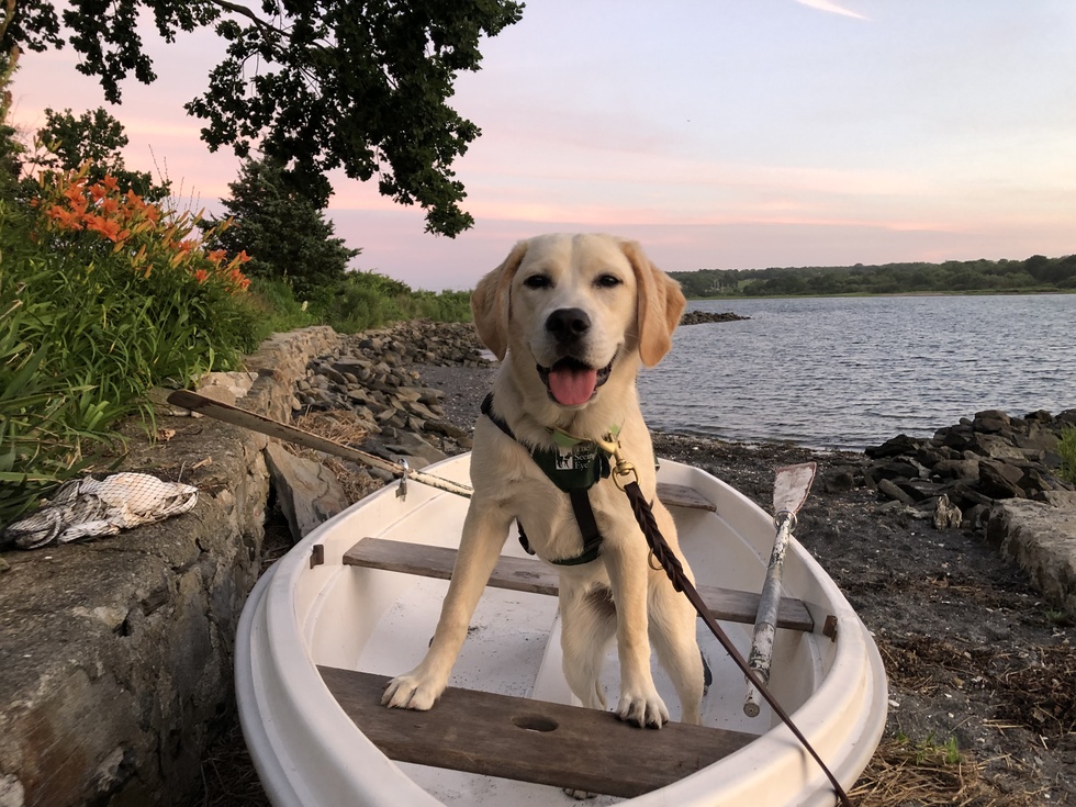 Joyce, a smiling one-year-old yellow Labrador/golden retriever cross, stands in a rowboat resting on a small cove beach in Rhode Island. She is wearing her green Seeing Eye puppy vest, and a leather leash is hanging from her collar. The sun is setting in the background and the sky is light pink and purple. There is grass to the left, with some orange flowers and a rock wall separating the grass from the sand. The rowboat is white with wooden benches and an oar hangs off one side.