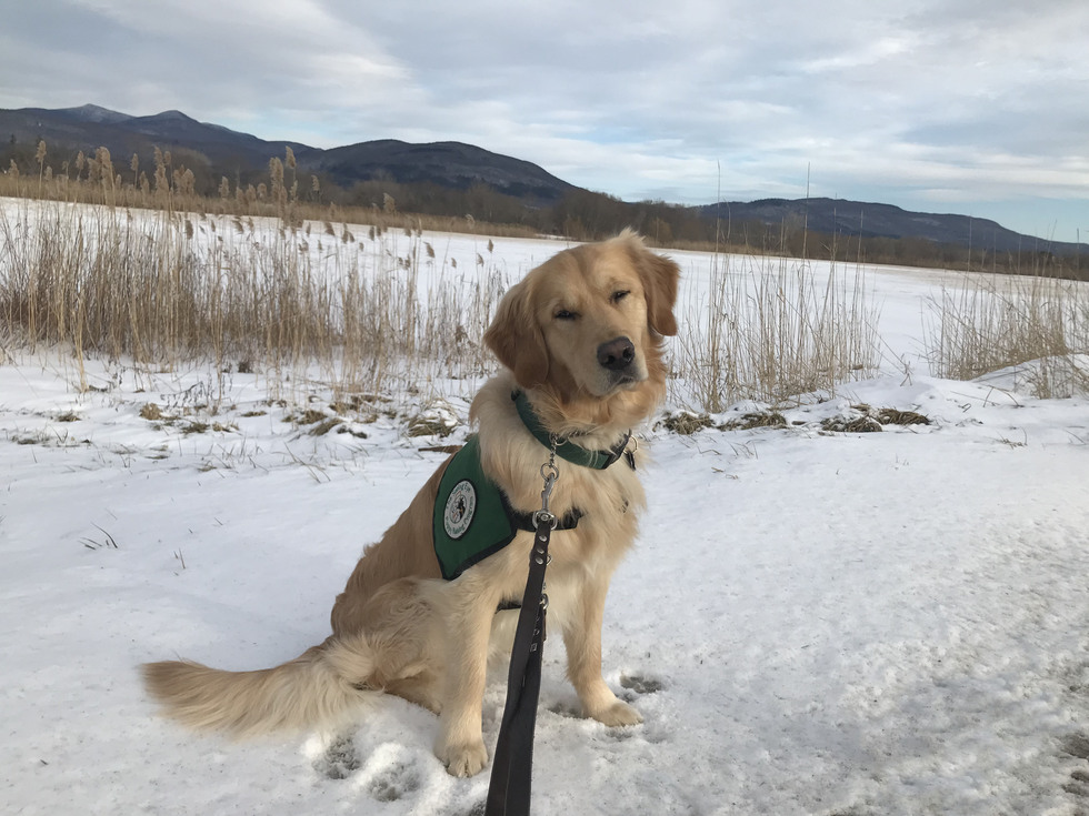 A full-grown male golden retriever puppy named Will is seated in the middle of a snowy landscape. He is wearing a green collar and a green Seeing Eye puppy vest. There is a majestic mountain range in the background. Tall, tan brush in the background matches both the colors of the landscape and the color of the puppy's long, fluffy fur.