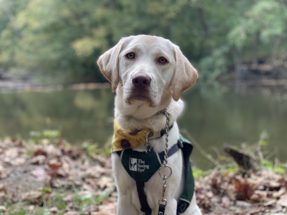 Francis, a young yellow Labrador/golden retriever cross is sitting on a riverbank enjoying a cool autumn day. The camera is focused on her with the background slightly blurred. There are fallen leaves on the ground and a still river behind her surrounded by green trees. She is wearing her green Seeing Eye puppy vest with the Seeing Eye logo in the front of her chest staring intently into the camera with her light green eyes. Peeking around her neck is a dark yellow sunflower bandana attached to her flat collar that stands out against her fur.