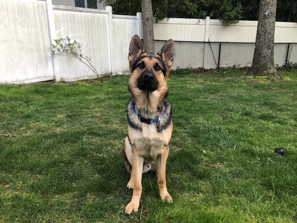 Boris, a handsome German shepherd, is at attention looking right at the camera awaiting his next command. He is sitting in his beautiful backyard on a lush green lawn surrounded by two mature trees and a wall of tall, white, slatted fencing. His ears are erect, his eyes focused and ready for work and/or play!
