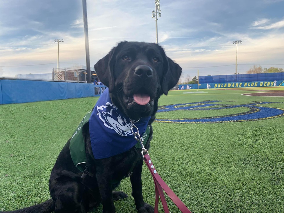Henley, a 17-month-old female black Labrador/golden retriever cross, is sitting close to the camera, her eyes looking just over it. She is smiling, revealing some of her pink tongue. She is sitting on a bright green turf baseball field with a blue and gold University of Delaware logo painted on the turf and visible to the right of the dog. She wears her green Seeing Eye puppy vest, and a blue University of Delaware logo scarf is hanging slightly to her side, clearly visible. A mauve leash is attached to her silver training collar, slightly slack. In the background is a blue barrier with “Delaware Blue Hens” on it in gold print as well as several baseball players warming up in the distance. Four game lights and a portion of the dugout are also visible behind her.