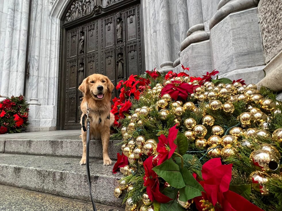 A 20-month-old golden retriever sits on gray stone steps outside of St. Patrick’s Cathedral in New York City. Next to him are poinsettia plants with red flowers that are intertwined with evergreen boughs strung with round gold ornaments. He is looking at the camera with his mouth open and tongue out showing a big smile.