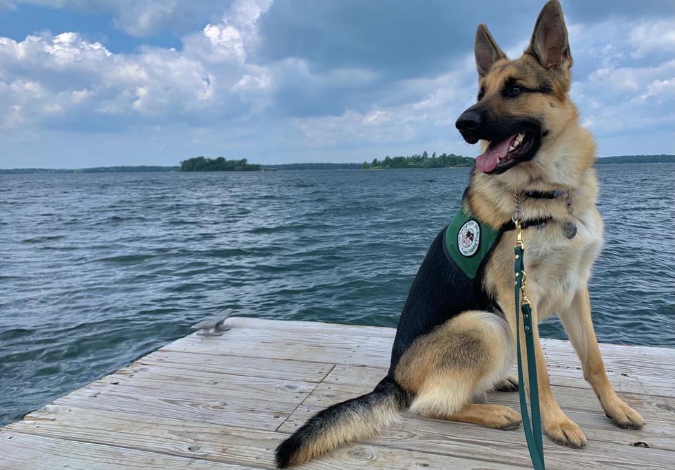 Trent, a handsome black and tan German shepherd, sits on a wooden dock wearing his green Seeing Eye puppy vest. His body is facing the camera, but his head is turned to the left as he looks off to the side. Behind him, you can see deep blue water that is rippled with small waves. Off in the distance are several islands with trees.