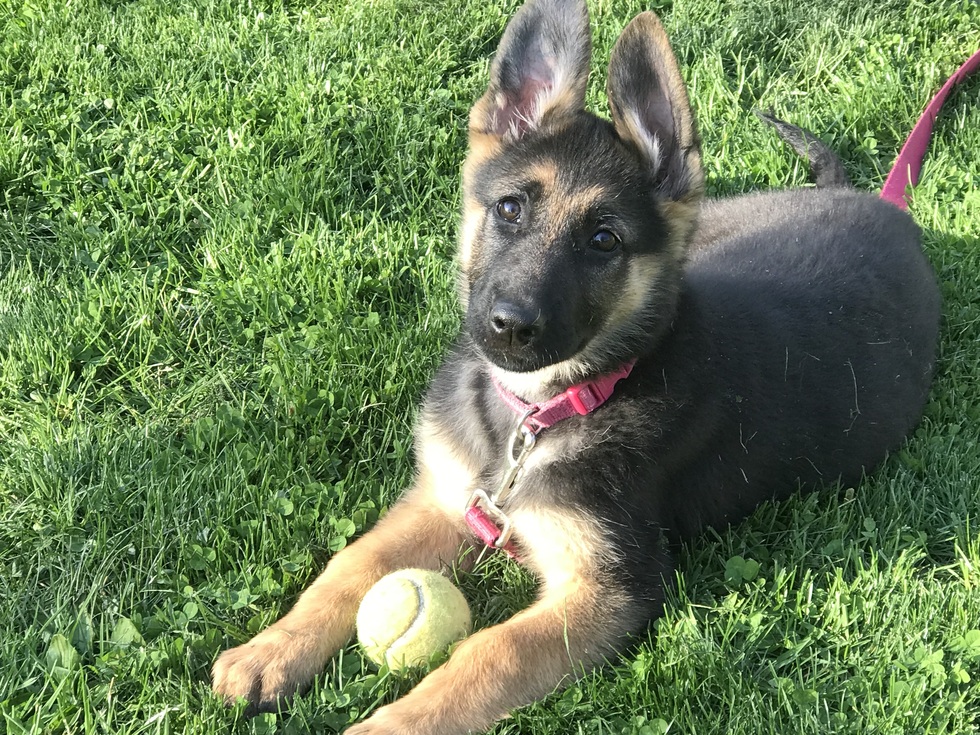 Pictured is Heidi, a cute 12-week-old black and tan German shepherd. She lies on a lush carpet of green grass, speckled with sunlight and shadows of late afternoon. She poses with a yellow tennis ball between her two front paws as she looks intently upward at the camera. Her right ear is alertly straight, but her left ear holds that signature tilt toward the center. She is wearing a bright pink color and leash.