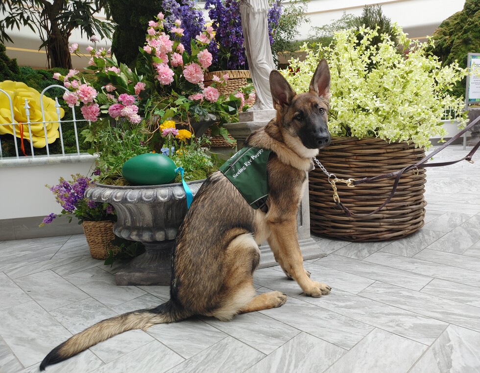 Francie, a beautiful six-month-old female sable German shepherd sits in front of an Easter display at the American Dream Mall in New Jersey. She is looking over her shoulder at the camera and wearing her green Seeing Eye puppy vest. The display includes yellow, purple, and pink flowers and a large green Easter egg.