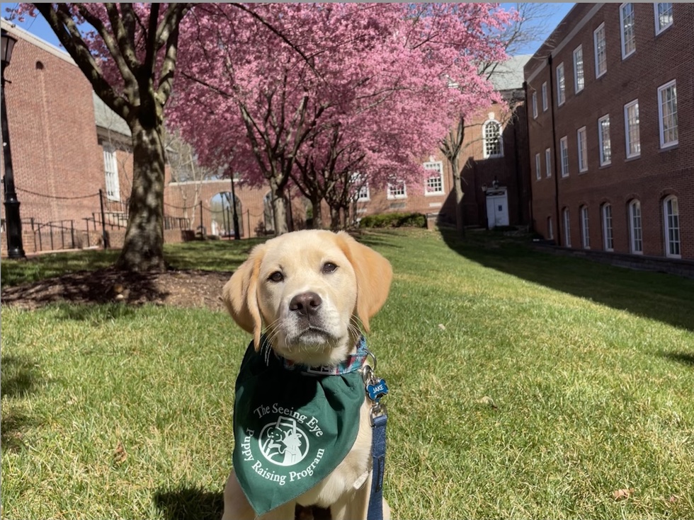 Jake, a four-month-old yellow Labrador/golden retriever cross sits in the grass close to the camera, his head slightly tilted to the left. Behind him, pink cherry blossom trees are in bloom and there are brick buildings to the right and in the background. He wears his green Seeing Eye puppy scarf over his chest and looks directly into the camera with brown eyes, ears perked forward. His ears are a dark yellow while the rest of his body is a lighter shade, and he has white coloring around his nose and mouth.